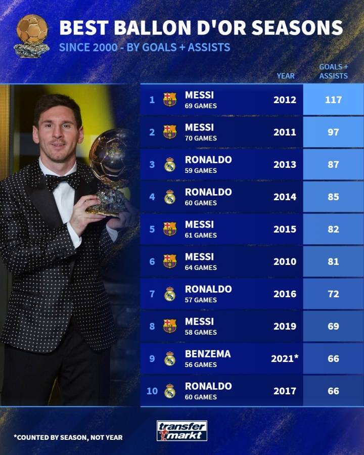 2012年的梅西可以跟其他年份的梅西竞争史上最强单赛季表现,所以他在这个金球奖相关榜单上就是榜首。2012年的梅西光进球就有91个,助攻也有26个,当时69场造进球117个,唯一上三位数的球员。